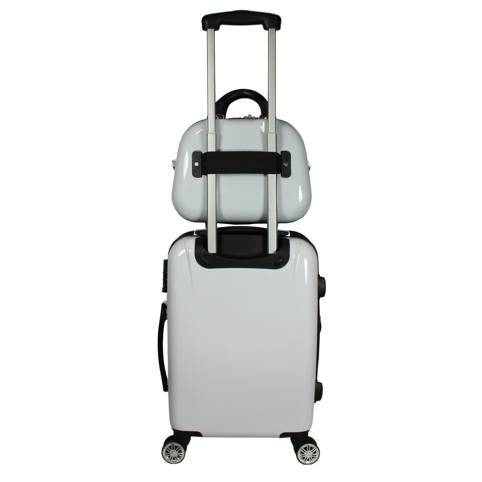 Push-button self-locking internally stored retractable handle system and eight (8) 360 degree spinner wheels