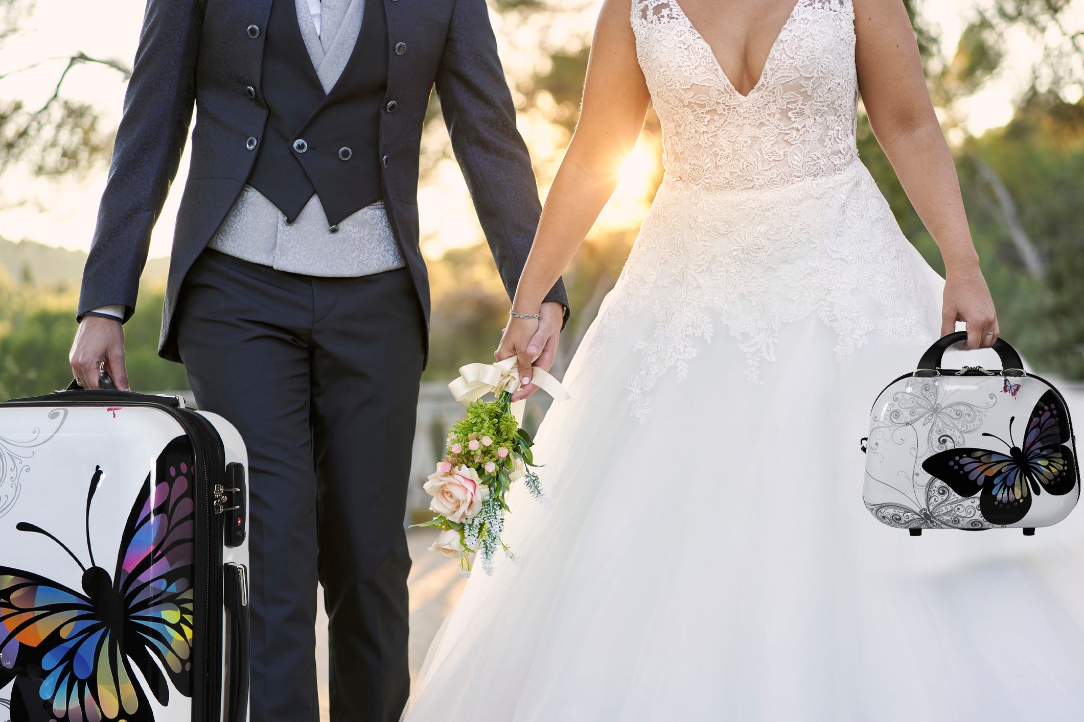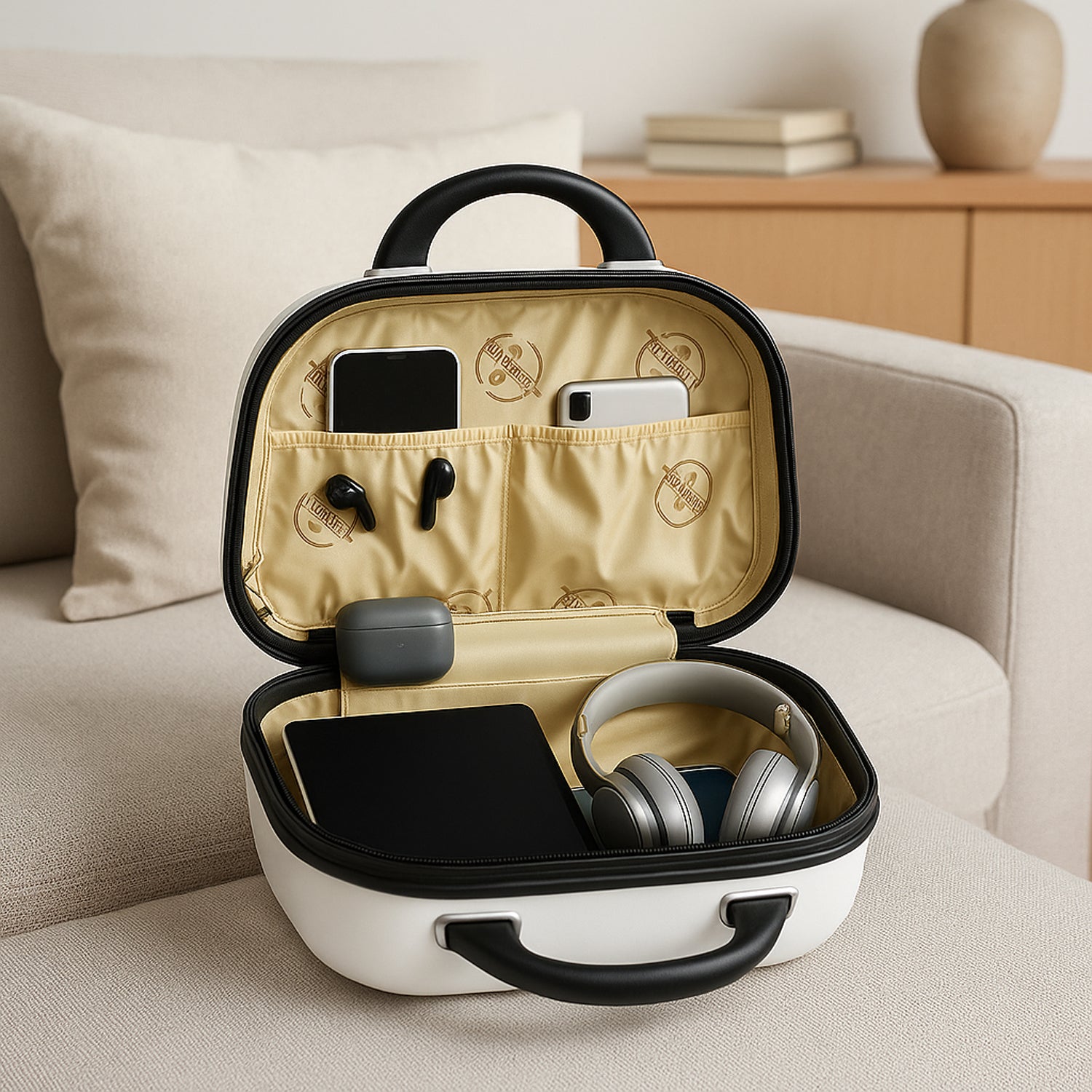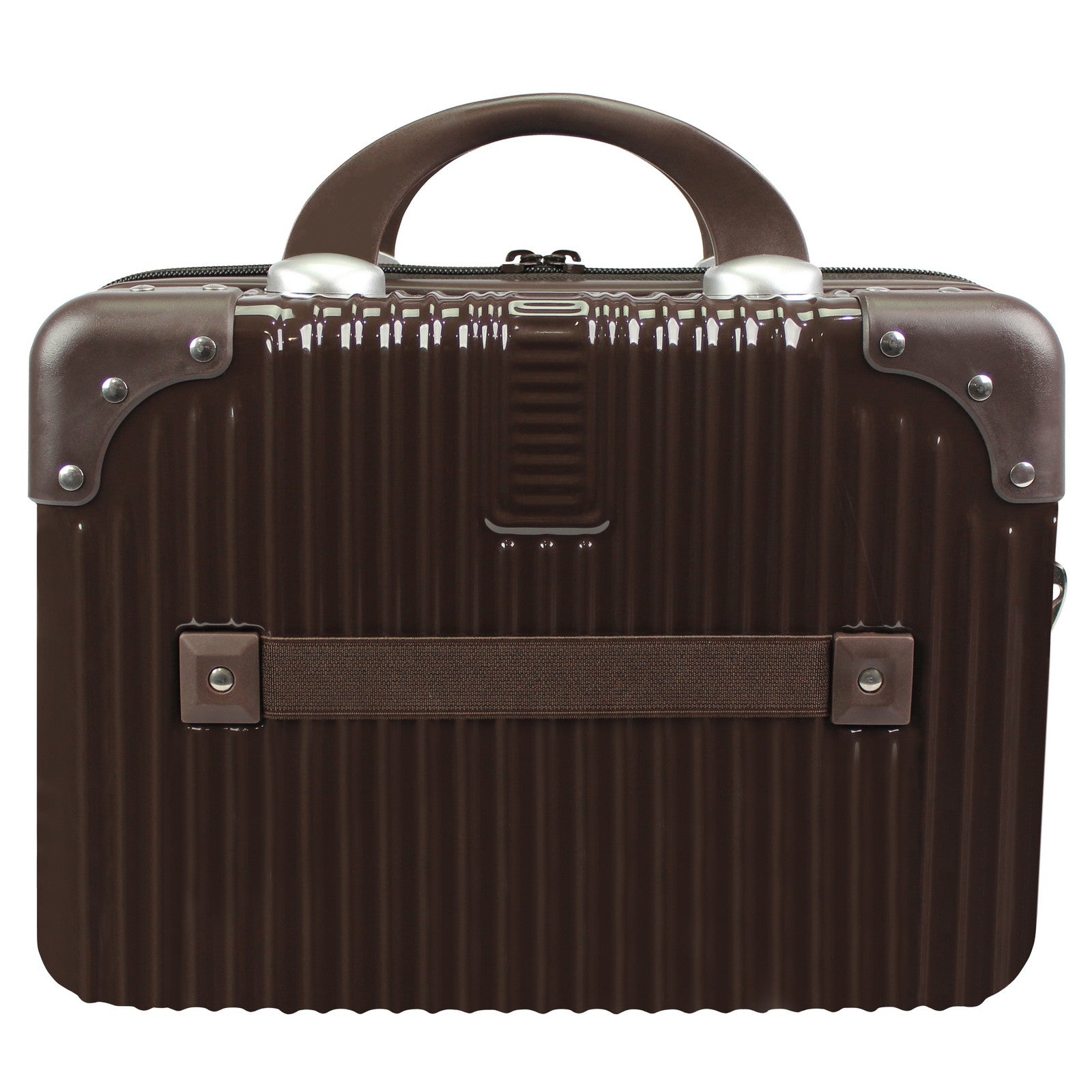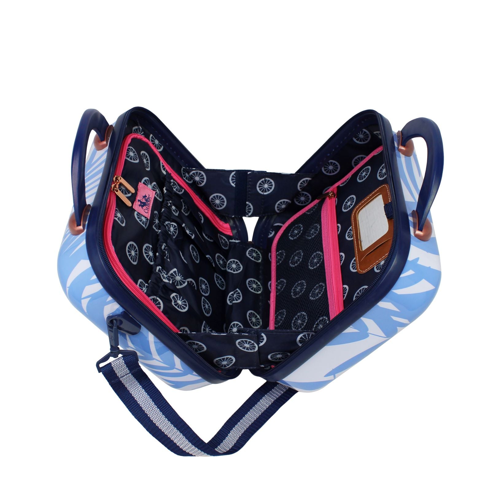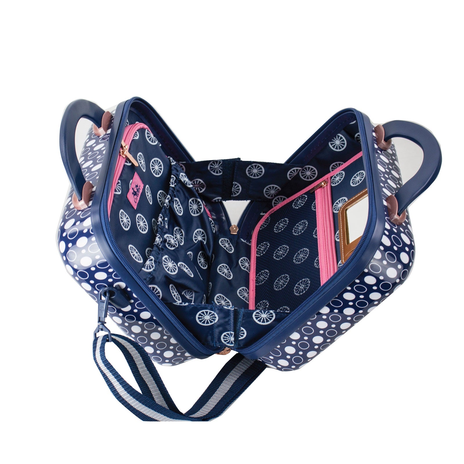 The Beauty case features a rear strap that slides over the luggage handle, a zipper divider, accessory pockets and most styles include a removable and adjustable shoulder strap