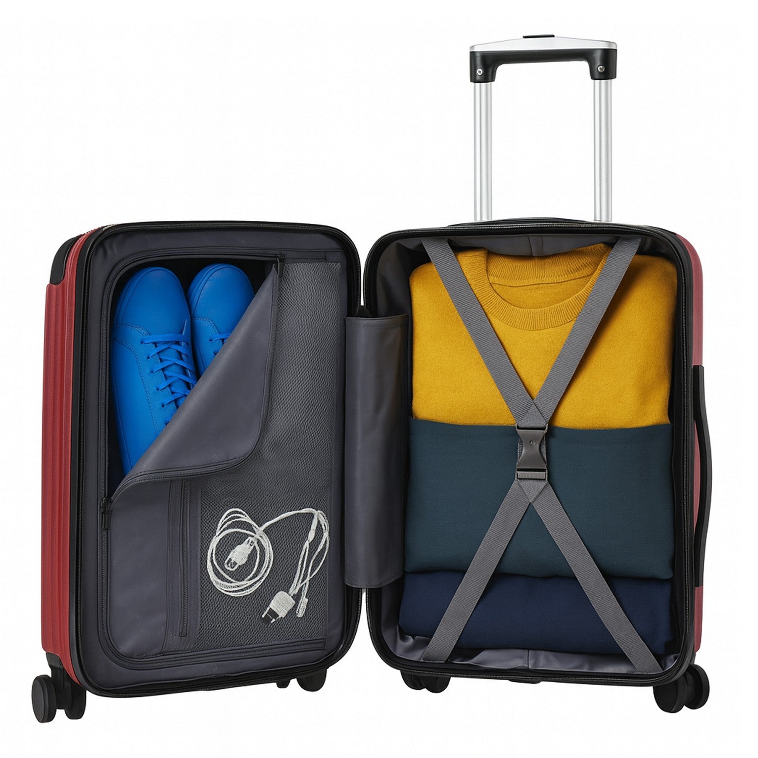 Inside, the fully lined interior is thoughtfully organized with a zippered divider, a large mesh zipper pocket, and adjustable webbing straps that secure and organize your belongings. Whether you're heading out for a weekend getaway or an extended trip, this luggage is the perfect combination of functionality, durability, and refined style.