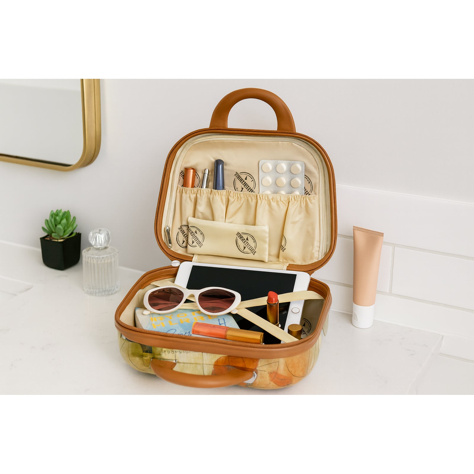 Inspired by the World Geography, this lightweight fully lined luggage glides effortlessly with the help of four 360-degree wheels that change direction at a second's notice. A unique design and modern twist to the traditional luggage, ideal for the fashion-forward and experienced traveler. It features a 2-inch expandable design for added packing capacity, spinner wheels, a built-in 3-digit TSA combination lock, carry handles, and a retractable handle system. Its fully lined interior features a zipper divider, tie-down straps, and accessory pockets. The cosmetic travel bag features a zipper divider, one accessory pocket with an elastic band, a detachable shoulder strap, and a rear strap that slides over the luggage handle.