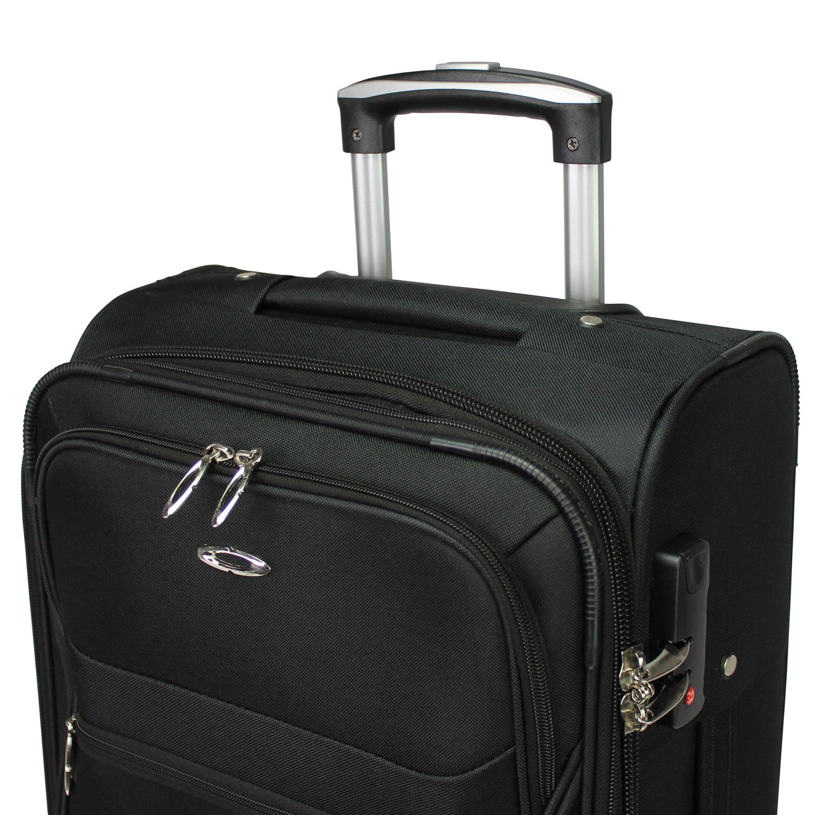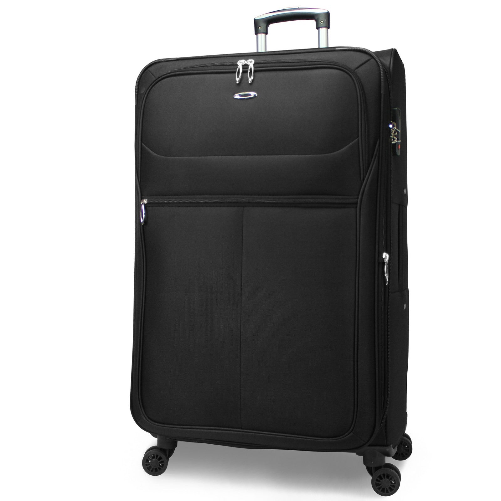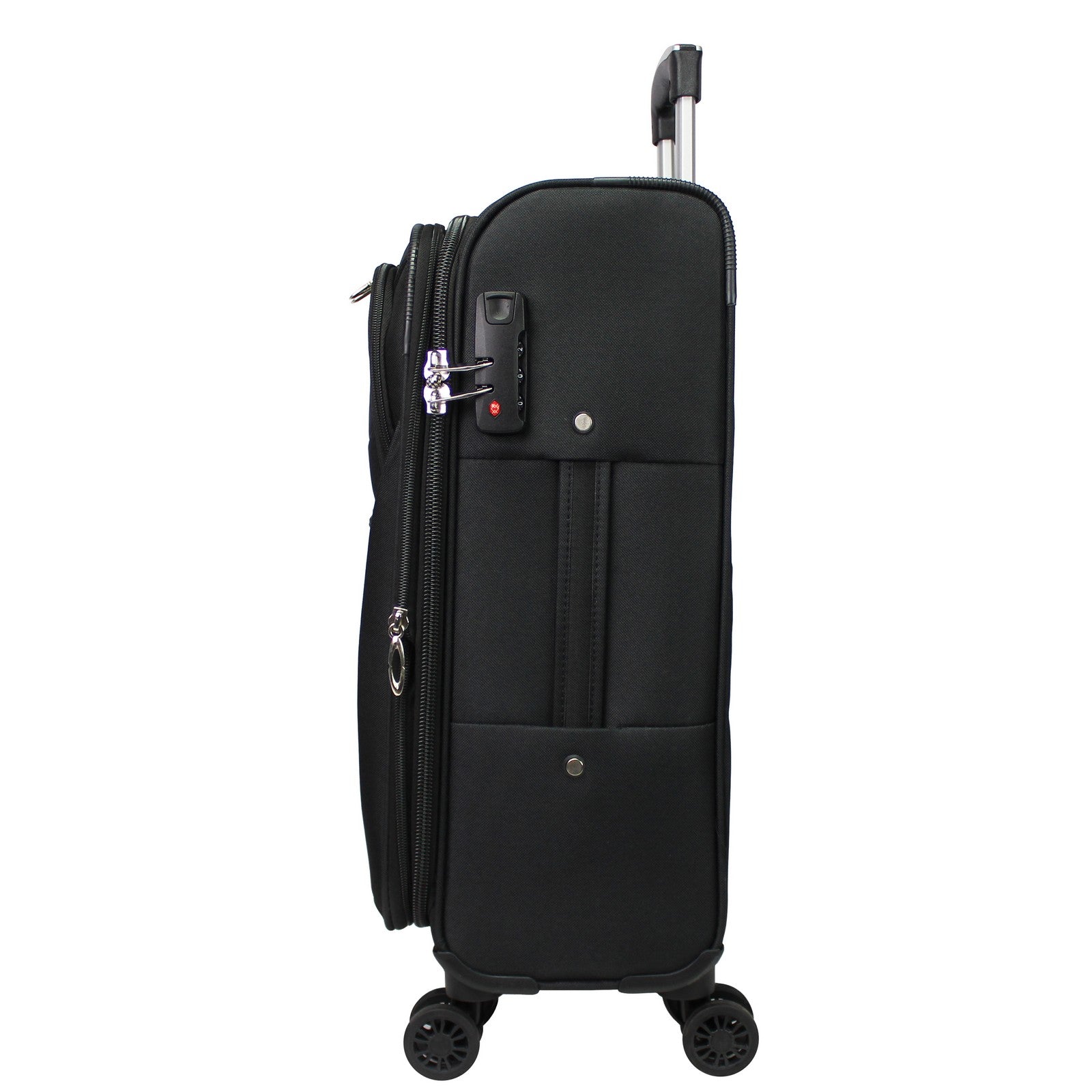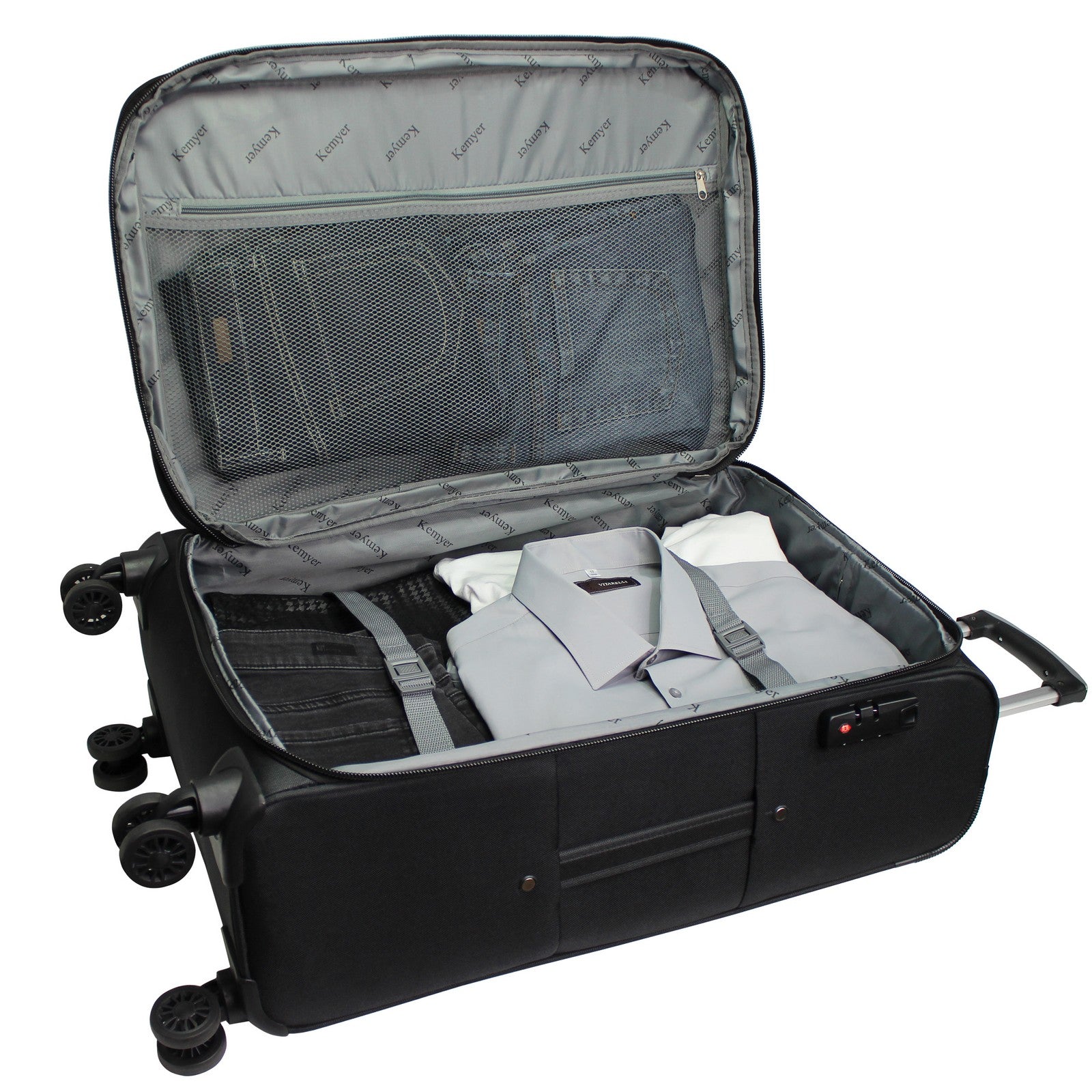 2-inch expandable feature, Built-in 3-digit combination lock, Top and side grip handles, fully lined interior with large mesh zipper pocket, and compression straps