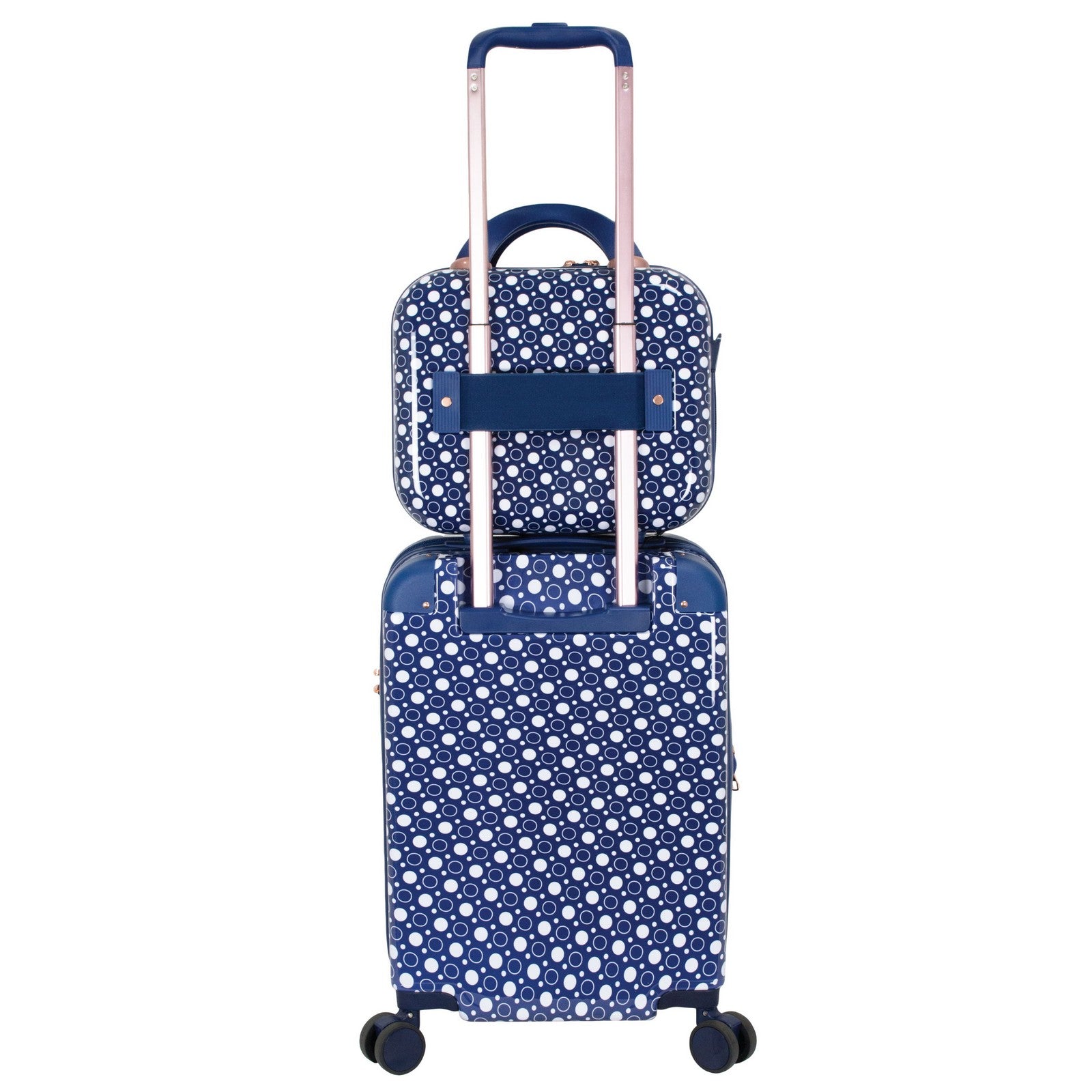 The matching travel case can hold favorite toys, electronics, or personal items, featuring a vanity mirror, a strap to attach to the luggage handle, and a removable shoulder strap for hands-free carrying.