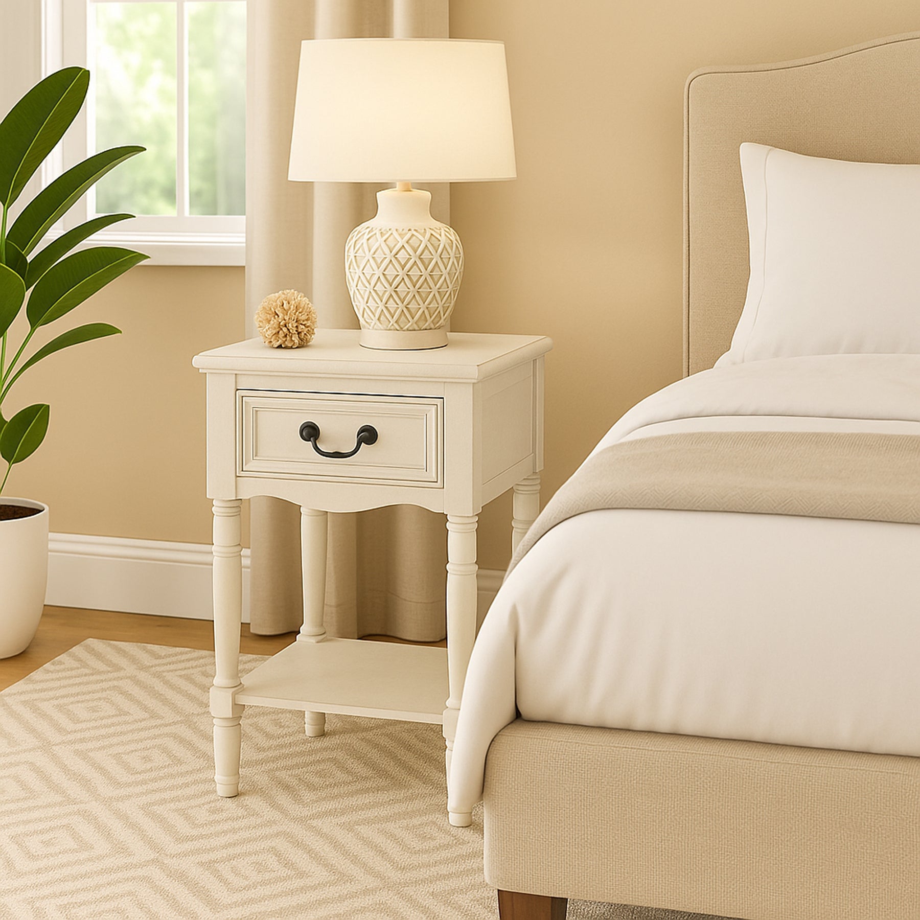 Bring timeless charm to your bedroom or living space with this beautifully crafted accent table nightstand, inspired by the refined elegance of late 18th-century French design. Its clean lines, square silhouette, and hand-painted finish echo the classical styling of the period while offering modern-day versatility. Each piece is expertly made from solid hardwood and MDF material and finished with a hand-applied, multi-step distressing technique, giving it a unique, antique character that adds warmth and authenticity to any room.