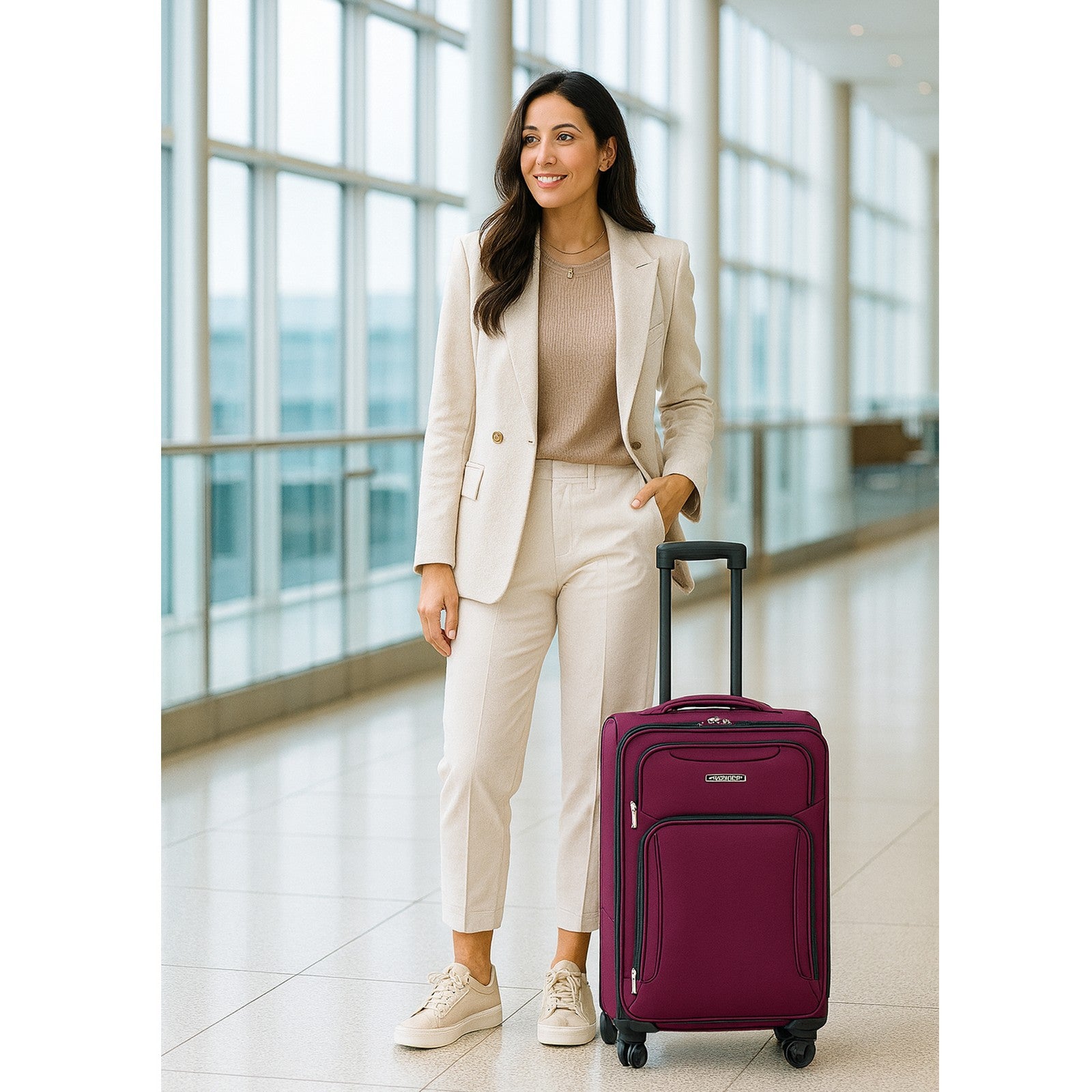 Travel confidently with this versatile luggage, designed to combine durability, convenience, and organization for every journey. Crafted from high-density polyester, the exterior offers lightweight strength that resists wear while maintaining a clean, professional look. The telescopic handle and smooth eight-wheel spinner system provide effortless 360-degree navigation through airports, stations, and city streets. For added convenience, each piece includes top and side carry handles for easy lifting. The 2-inch expandable design gives you extra packing capacity without sacrificing maneuverability. Two front zipper pockets offer quick access to travel documents, electronics, or other on-the-go essentials, while the rear ID tag helps ensure your luggage is easily identifiable. Inside, the fully lined interior is thoughtfully arranged to keep your belongings neat and secure. A large mesh zipper pocket and a smaller mesh zipper pocket are ideal for accessories, undergarments, or toiletries. Adjustable webbing tie-down straps hold clothing in place to minimize wrinkles and shifting during travel. Whether you’re heading out for a weekend getaway or a long adventure, this luggage delivers the perfect combination of practicality, durability, and style.