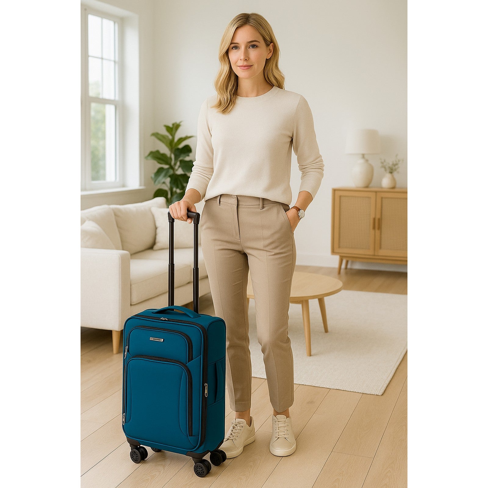 Smooth & Easy Maneuverability – Features eight 360° spinner wheels, a telescopic handle, and top and side carry handles for effortless navigation and lifting