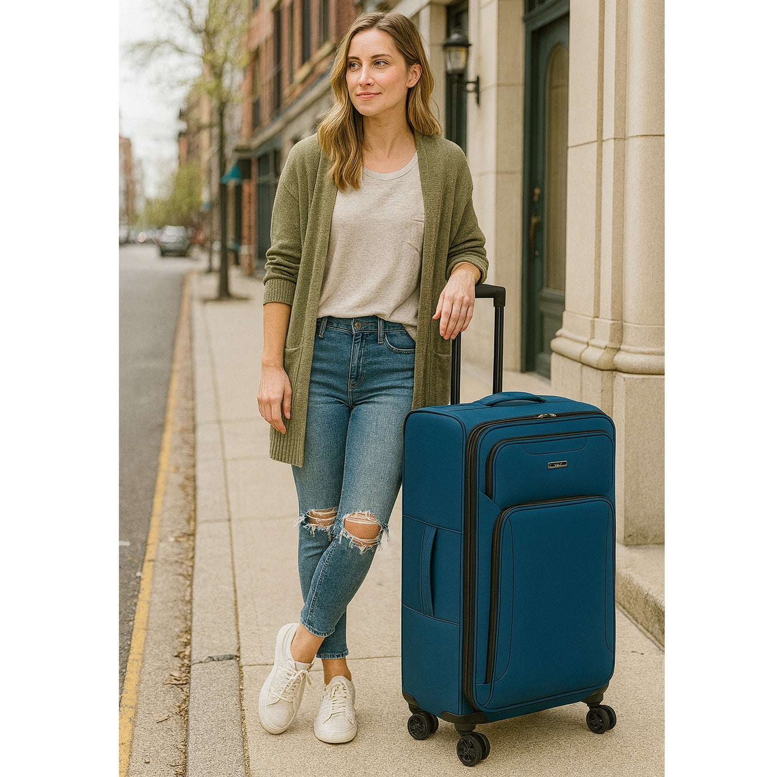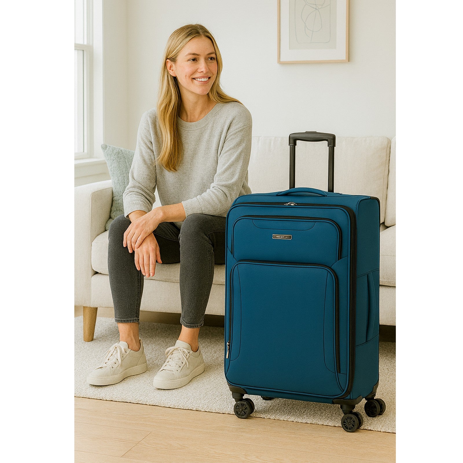 Smooth & Easy Maneuverability – Features eight 360° spinner wheels, a telescopic handle, and top and side carry handles for effortless navigation and lifting